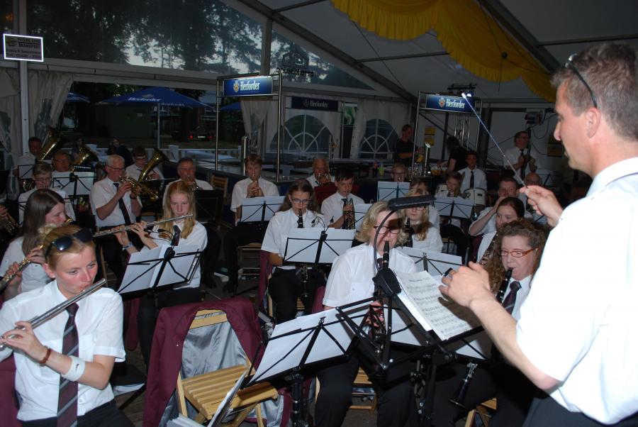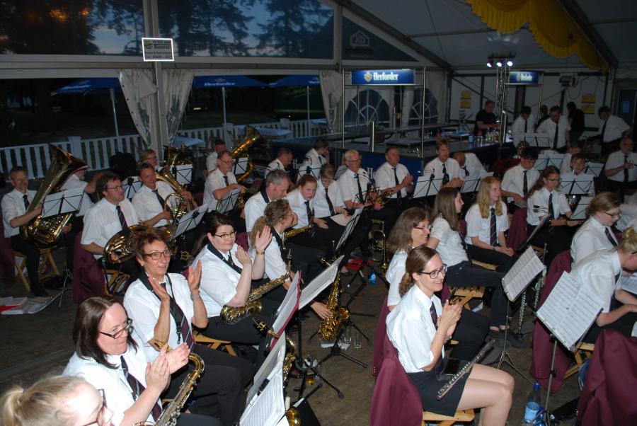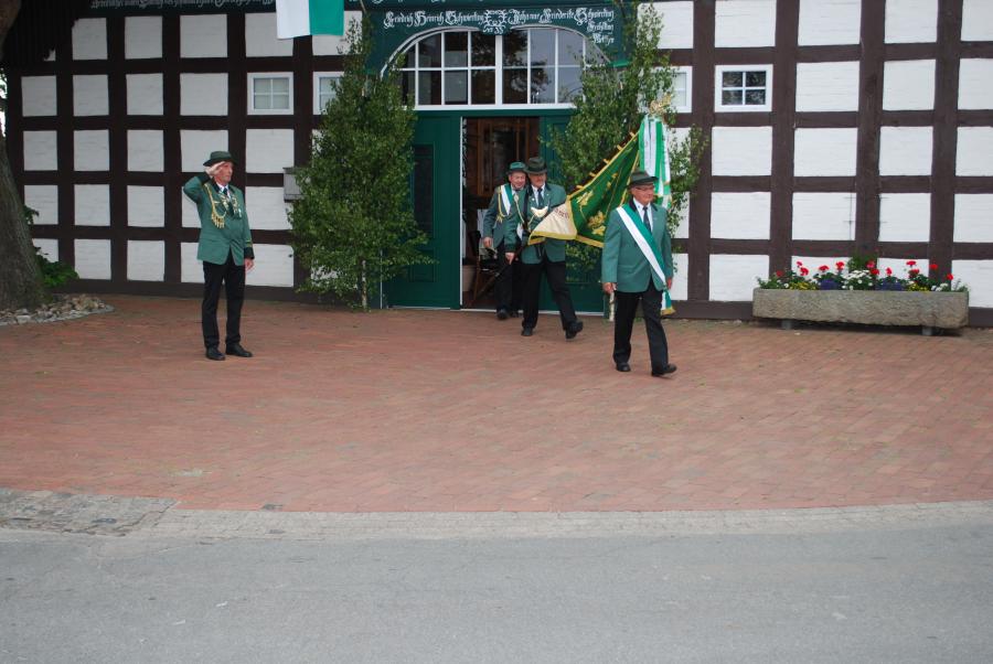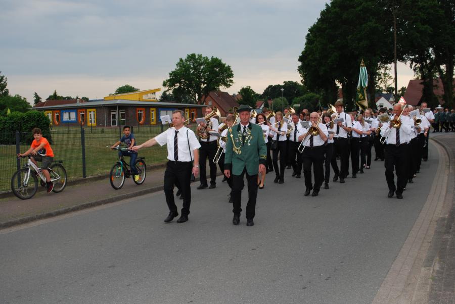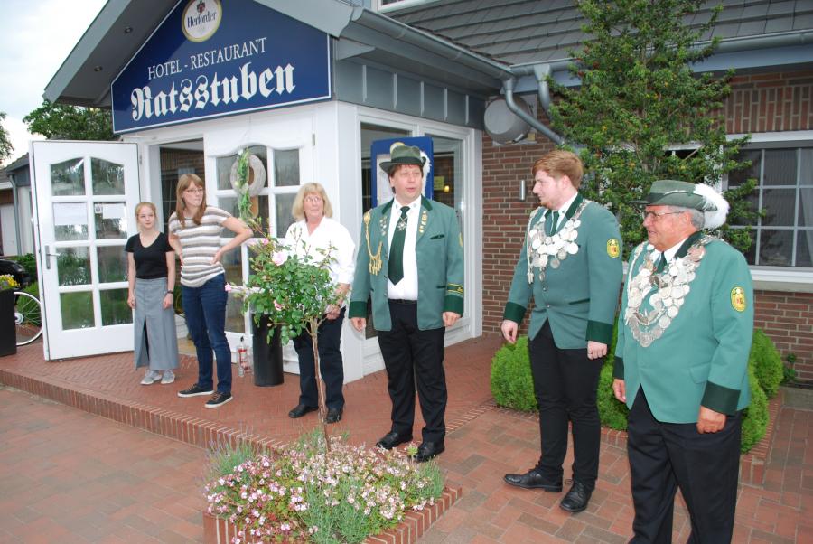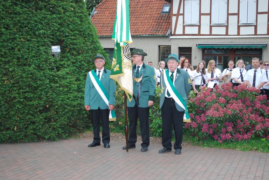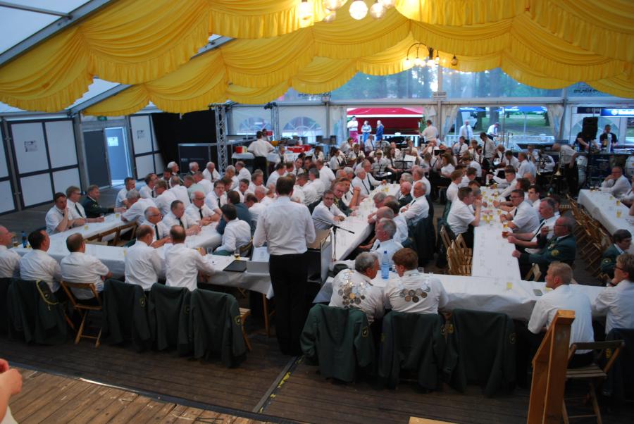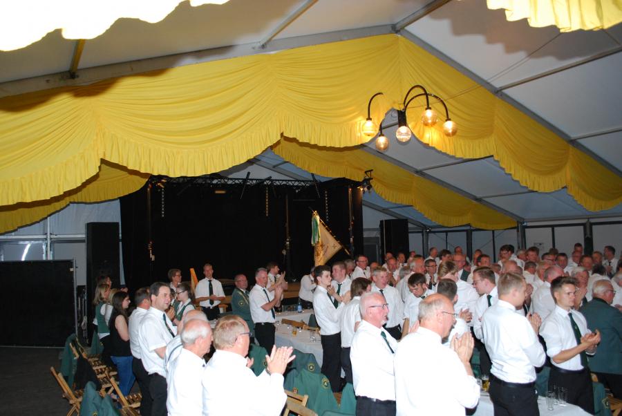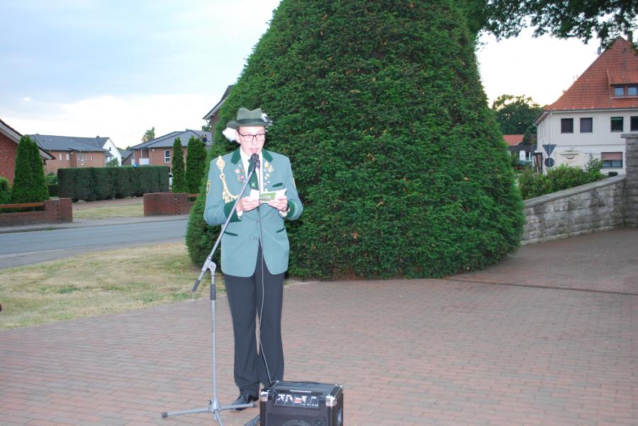 Angesichts der Temperaturen nahm der Festzug den schon traditionellen Zwischstopp bei den Ratsstuben gerne an. Anschließend führte der Ausmarsch die Schützen/innen an das Kriegerdenkmal an der Kirche. Hier sprach unser zweiter Präsident Tobias Winkelmann-Bünte mahnende, aber auch erinnernde Worte, damit so etwas nicht noch einmal unser Land heimsuchen möge. 73 Jahre nach Ende des Zweiten Weltkriegs möge man die für ihr Heimatland Gefallenen nicht vergessen. aber auch Terror und Angst dürften sich nicht weiter ausbreiten oder verstärken. Vom Kriegerdenkmal ging es dann ins Festzelt. Dort dankte Thomas Nowak den noch amtierenden Würdenträgern, allen voran seine Majestät Heinrich Sandmann " der Ausdauernde" , Jugendmajestät Niklas Bollhorst "der Vollblutschütze" , Schützenliesel Karola Ziegler, König der Könige Rüdiger Jahn, sowie dem Musikzug Lutten für dessen tolle Marschbegleitung. Sein Dank galt auch den zahlreichen Geschäftsleuten und Privatpersonen. die mit ihren Spenden zum Gelingen des Zapfenstreichs beigetragen hatten. Besonders hieß er die Ehrenpräsidenten Wilhelm Evers und Harry Johanning, Bürgermeister Wilhelm Grelle und den Schützenfestwirt Karl-Wilhelm Bruns willkommen. Der Zapfenstreich ist dem Vorstand auch immer eine gute Gelegenheit, langjährige Mitglieder zu ehren.
